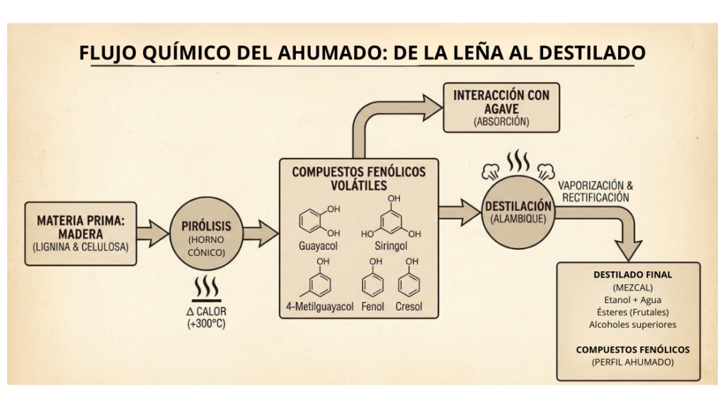 En el estudio de los destilados mexicanos cocidos con leña, el ahumado suele ser el primer descriptor que aparece, pero es el último en ser comprendido profundamente. Para el equipo de vinomezcal.mx, el ahumado no es una “capa de sabor” añadida, sino una modificación estructural resultante de la interacción termoquímica entre la biomasa de la madera, el horno y el tejido del maguey.